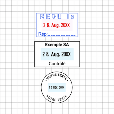 De plus, vous trouverez des tampons dateurs avec textes standards, des dateurs avec dessins éditables, tampons dateurs comptables et dateurs multiformules.