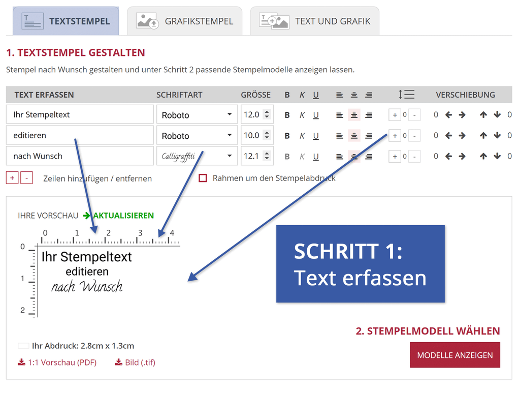 Im ersten Schritt können Sie im Stempel-Editor die gewünschte Anzahl Textzeilen erfassen, Schriftarten auswählen und die Zeilenabstände verändern. Editieren Sie Ihren Text nach Wunsch und Sie sehen direkt in der Vorschau, wie Ihr Stempelabdruck aussehen wird, und wie gross Ihr Abdruck wird.