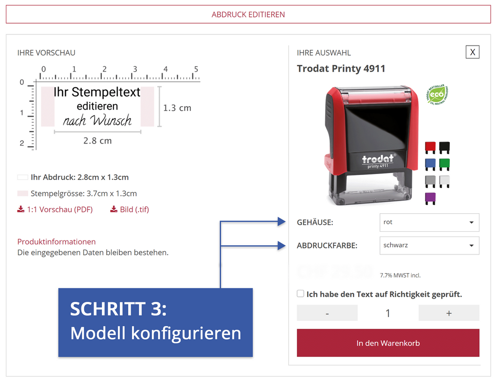 Wenn Sie Ihr gewünschtes Stempel Modell online ausgewählt haben, können Sie im dritten und letzten Schritt Ihren Wunschstempel konfigurieren. Sie wählen hier online die Farbe des Stempelgehäuses, sowie des Stempelabdrucks. Unser System zeigt Ihnen nun auch wie gross Ihr Abdruck sein wird und die mögliche Stempelgrösse des von Ihnen gewählten Stempelmodells.